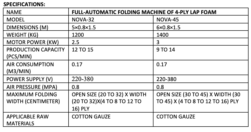 - USED FOR FULL-AUTOMATIC FOLDING OF SURGICAL TOWEL, LAP FOAM AND ABDOMINAL TOWEL.
